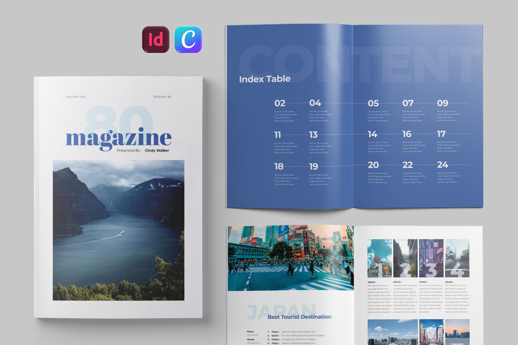 You can design a modern and minimal lifestyle magazine using this InDesign template. It features a clean design that allows you to effectively highlight the contents of your magazine more easily. The template is compatible with InDesign CS4 to CS6 as well as CC.